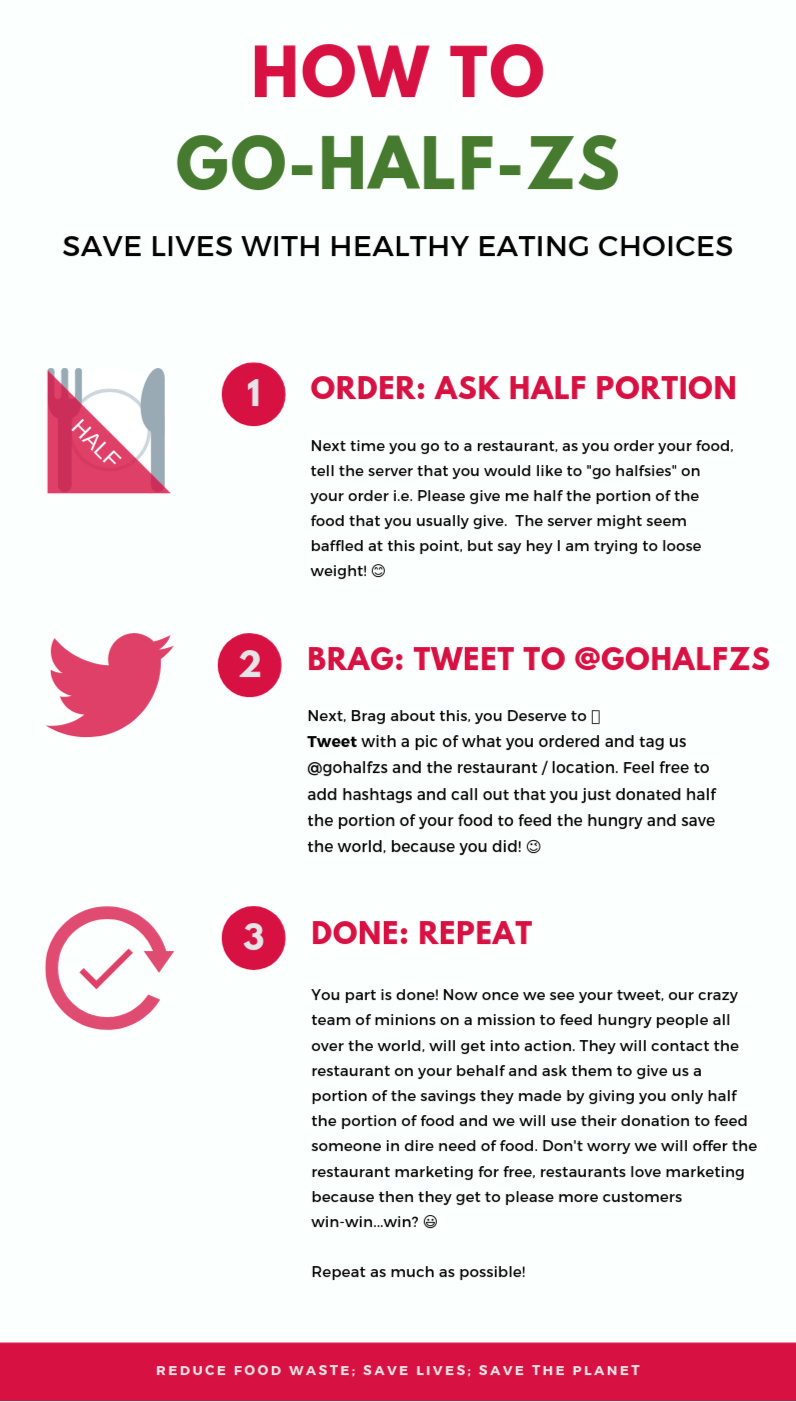 Now we all have been to a Diner or that restaurant we love that just serves you way too much food in a single portion.Now imagine when you go halfsies on your meal, that same restaurant will give you half the portion of the meal you ordered, which means they will use less food to cook your meal.Once you tweet to us, we will contact the restaurant on your behalf and collect a portion of the savings they made from cooking with less food, which will be use to send meals to all the unfortunate people around the world.